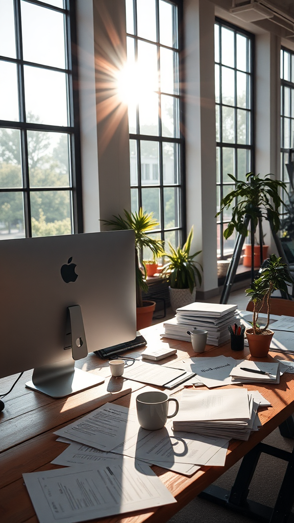A lifelike image of an office workspace showing an iMac Pro next to a slightly larger curved monitor on a wooden desk strewn with documents, a coffee mug, and a tiny potted plant; the sun streams through large windows, softly illuminating the scene. Shot with a wide-angle lens, the image captures the expansive and slightly messy desk, highlighting the hustle and creativity within the vibrant atmosphere of the office.