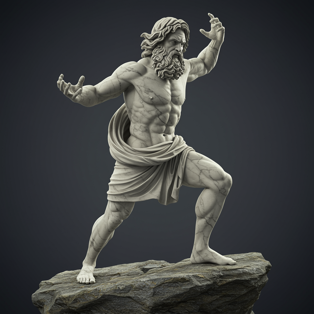 A lifelike marble sculpture of Zeus captured in a dynamic stance, poised on a rugged stone surface, evoking the artistic style of Clint Cearley with the realism of an Arnold render. The scene is enveloped in a slate gray atmosphere, featuring hyperdetailed, soothing tones that highlight the intricate and breathtaking details of the sculpture. The overall composition maintains a low contrast aesthetic, allowing the subtle nuances of the marble texture and Zeus's majestic presence to stand out gracefully.