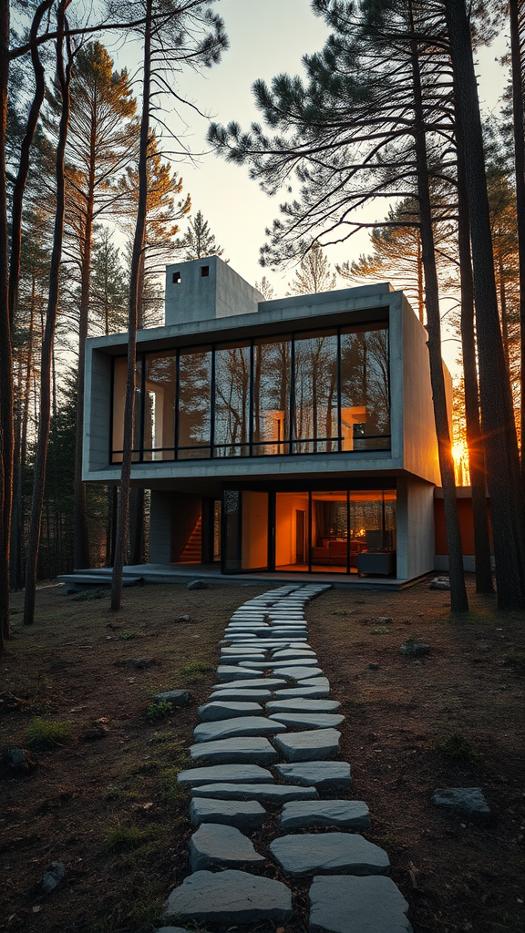 A lifelike photograph depicts a brutalist-style house situated within a dense forest during the golden hour of sunset. The home's structure prominently features extensive glass walls, allowing the surrounding wilderness to reflect on its surface. It is a testament to brutalism, showcasing raw concrete foundations and distinctive geometric shapes that blend seamlessly with large panes of glass. As the sun sets, a soft, amber glow envelops the scene, casting warm tones across the house's bold, angular lines. This creates a dramatic juxtaposition between the house's robust architectural design and the lush, organic beauty of the forest that envelops it. A pathway of natural stone leads up to the entrance, further integrating the modern structure into its serene environment.