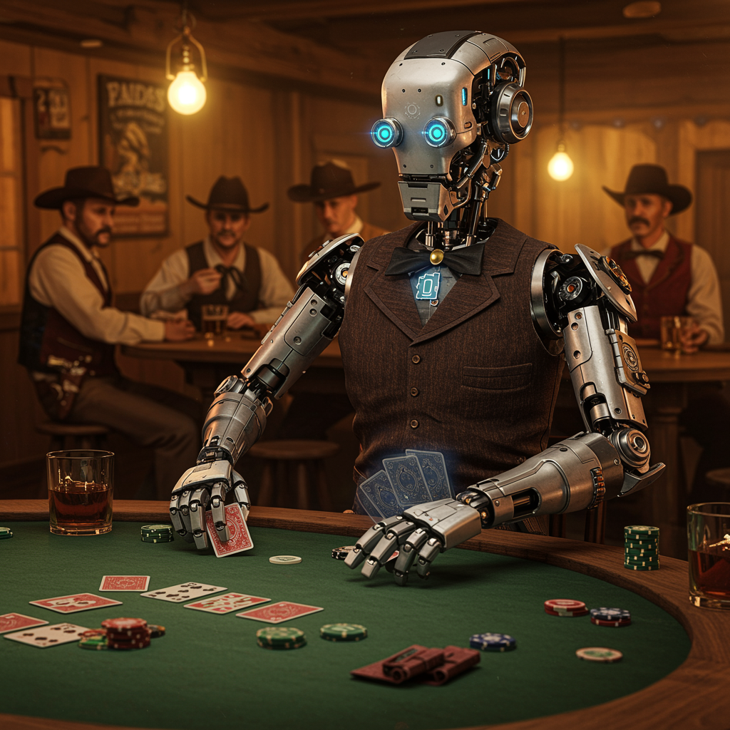 A lifelike portrait of a futuristic robot dressed in a Victorian-era ensemble, skillfully engaged in a high-stakes poker game inside a historic western saloon setting, where patrons don traditional cowboy hats and holstered revolvers that gleam under warm lantern lights, captured in RAW photo format with striking 8k ultra-high-definition clarity, utilizing a Fujifilm XT3 DSLR for an impeccable depiction of the scene's rich textures and vivid colors, including the robot's highly polished metallic features and intricately detailed card designs subtly enhanced with holographic displays, while the background features a classic wooden bar and patrons sipping drinks, creating a captivating blend of the old west and advanced technology.