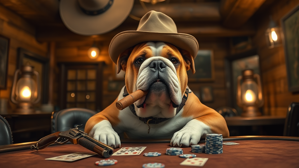 A lifelike portrait of an English bulldog intensely focused on a poker game in a classic western saloon setting, surrounded by rustic wooden walls and dimly lit oil lanterns casting a warm glow. The bulldog, adorned in a tiny cowboy hat, sits confidently with a paw resting on a revolver by his side and a cigar clenched in his jowls. The poker table is cluttered with vintage playing cards and scattered poker chips. A large Stetson hat hangs from a wooden beam, adding to the authentic western vibe. The scene is captured in extraordinary detail with a Fujifilm XT3 camera, showcasing the rich textures of the bulldog’s fur and the weathered surfaces of the saloon in stunning 8k ultra high definition quality.