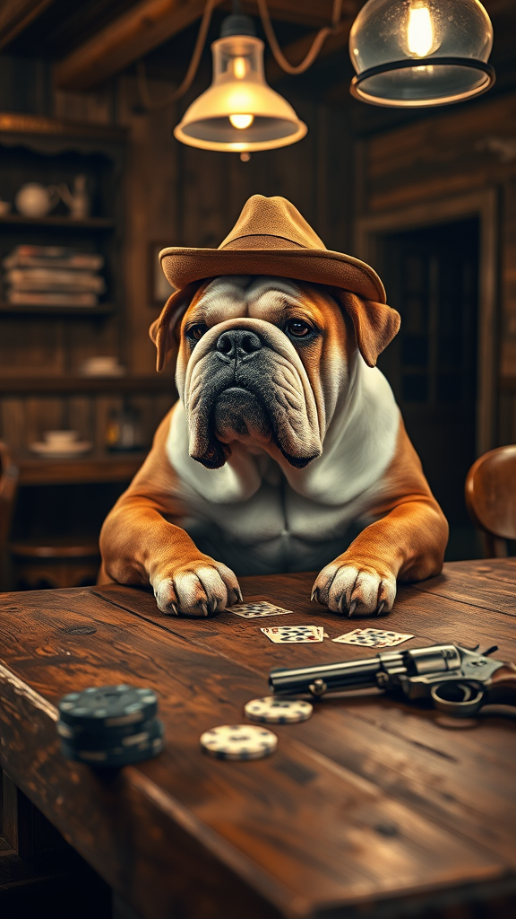 A lifelike portrait of an English bulldog seated at a worn wooden table in a classic western saloon, deep in concentration as it plays poker. The bulldog, wearing a small, worn cowboy hat slightly askew, exudes character and charm. Around the table, a scattering of old playing cards and poker chips hint at the intensity of the game. Nearby, a pair of vintage revolvers rest casually on the saloon's dusty wooden bar, reflecting the warm glow of antique oil lamps hanging overhead. The scene captures the rustic charm and gritty authenticity of the Old West, with the soft golden tones of the room contrasting against the bulldog's expressive, crinkled face. Shot in RAW, this high-quality, 8k UHD image is captured on a Fujifilm XT3, highlighting every detail of the saloon's rich textures and the bulldog's unique features, with a touch of whimsy that adds a playful twist to the classic western setting.