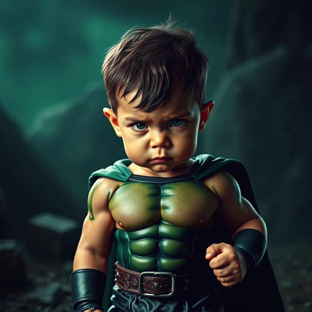 A lifelike portrayal of a toddler with extraordinary muscle definition, exuding an intense presence amidst a dramatic backdrop, showcasing vibrant greens and deep shadows to emphasize the powerful essence of a miniature superhero in a cinematic scene.