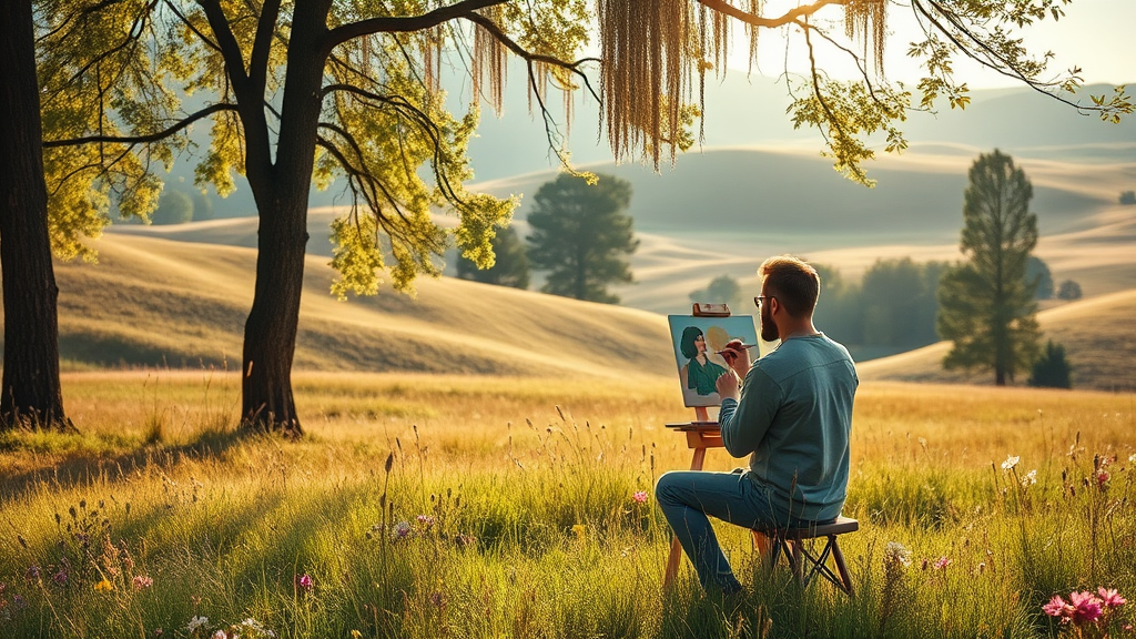 A lifelike scene of a person thoughtfully painting on an easel in a tranquil meadow surrounded by gentle hills and wildflowers, sunlight filtering through tall trees casting dappled shadows, with the artist deeply focused as a gentle breeze rustles the leaves.
