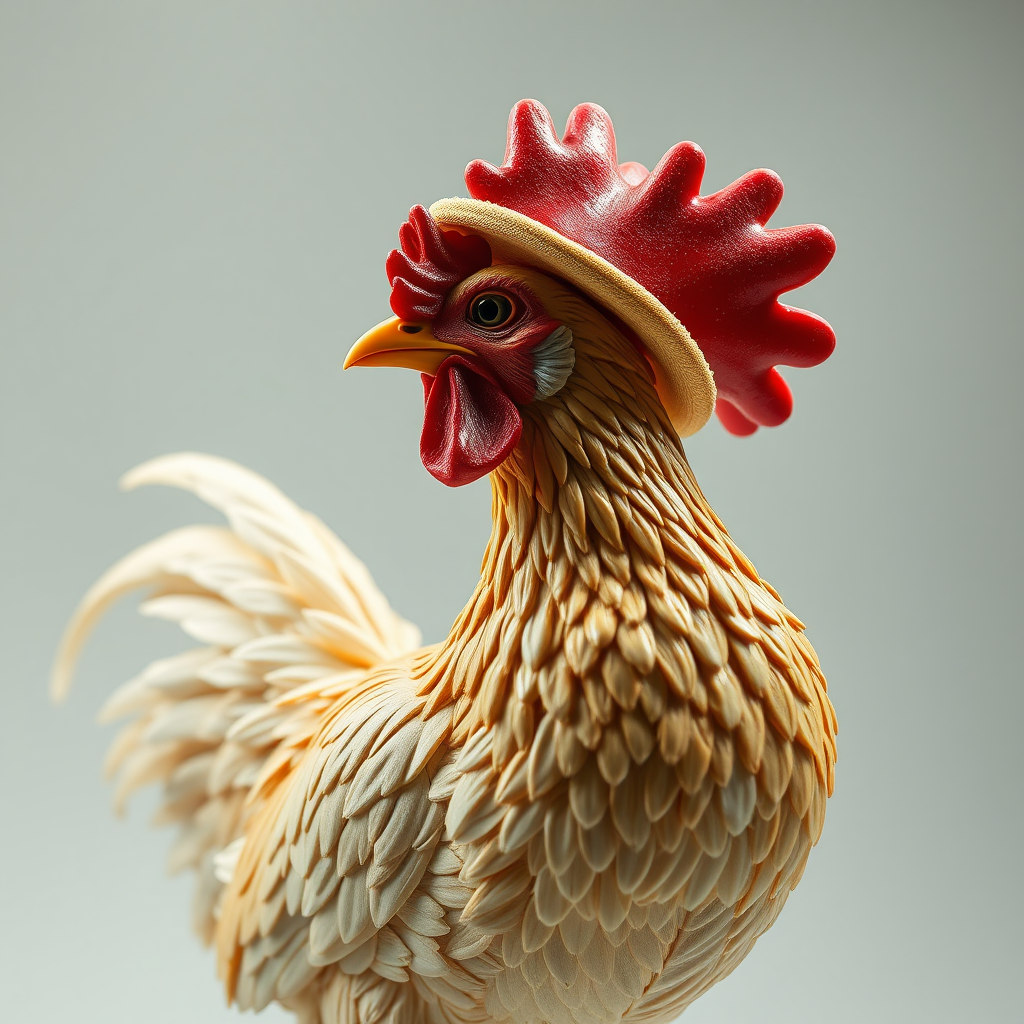 A lifelike sculpture of a chicken proudly donning a miniature chicken hat, capturing the dynamic movement and grace reminiscent of Lois Greenfield's photography, infused with the meticulous realism of Xu Beihong's work. The scene conveys an essence of humor and cleverness akin to Frank Weston Benson's vibrant paintings, presented with the charm and wit of a cleverly illustrated cartoon, captured in a time-lapse style showcasing the chicken's subtle motion, set in an upright portrait aspect ratio of 45:56.