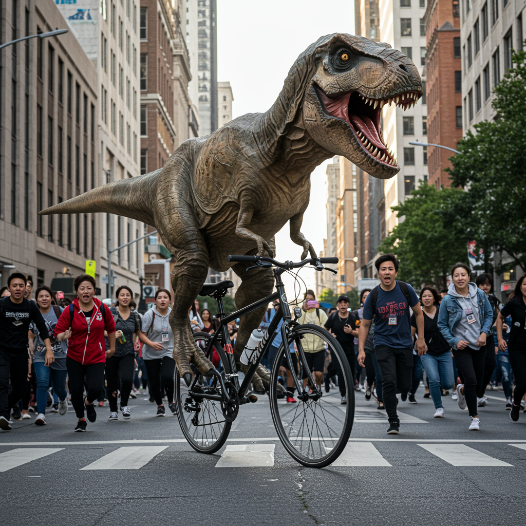 A lifelike Tyrannosaurus rex pedaling a bicycle through a bustling city street, with its powerful tail balancing onlookers fleeing in terror, faces painted with a mix of shock and awe as they scramble to escape the surreal scene.