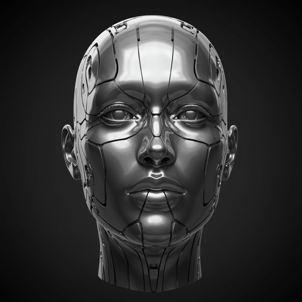 A lifelike, ultra-high-definition portrayal of a humanoid visage crafted from gleaming, polished metal, its surface contorted and warped into surreal, abstract forms. This visage exudes a stark, chrome-like finish, merging elements of the organic and mechanical in a seamless monochromatic palette. Playful distortions capture an enigmatic blend of life and automation, each facet intricately detailed to reflect a mesmerizing dance of light and shadow.