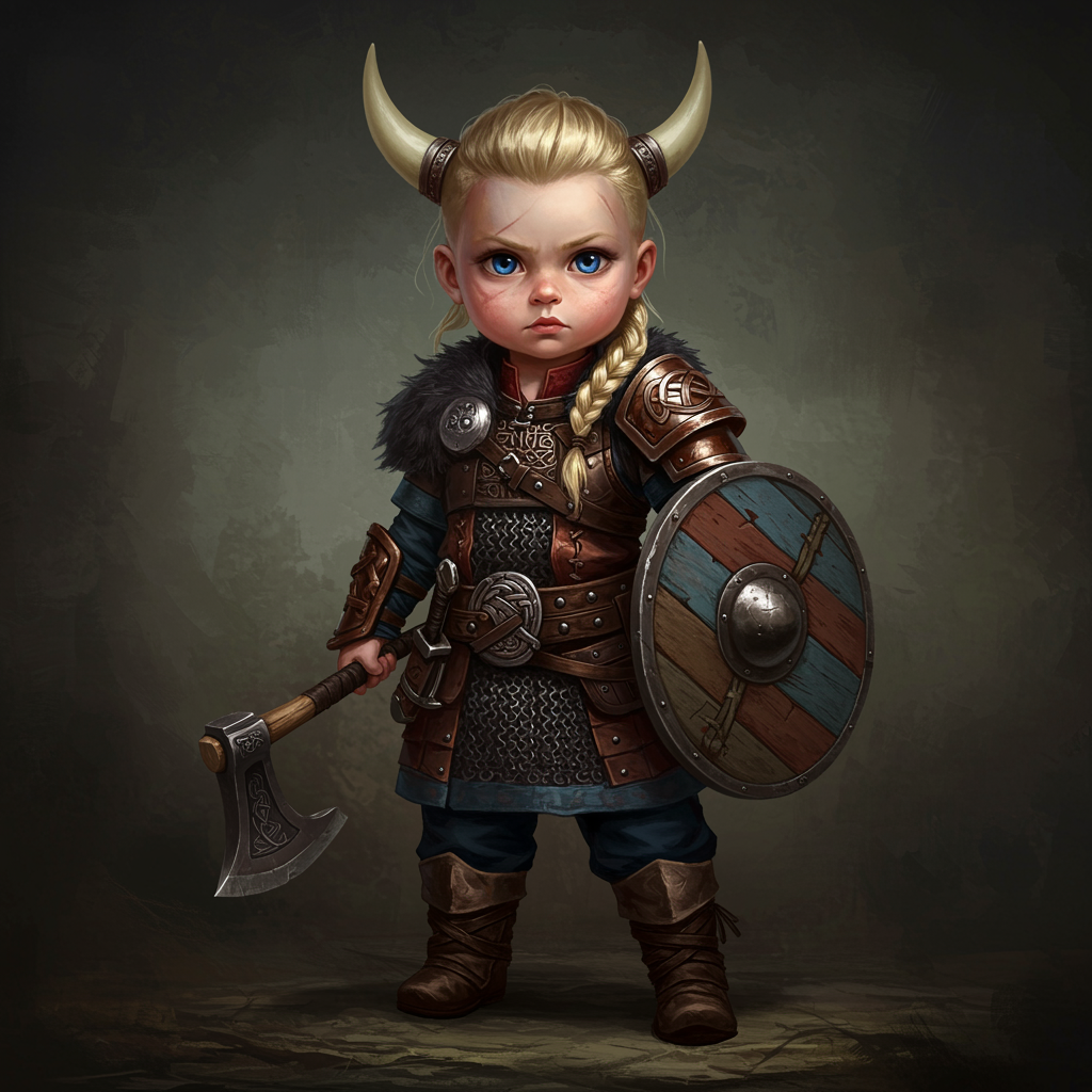 A little viking warrior girl stands confidently, clad in full intricate clothing that reflects a unique blend of traditional viking and biomutant design. Her small stature is framed by a dystopian backdrop, painted in a style reminiscent of dark, soft-focus plague-era oil paintings. The clothing features micro detail, with textures that hint at a mysterious past. Her bold, determined eyes peer forward, suggesting resilience and strength despite her age. Rendered in high-quality 4K, the colors are rich yet slightly muted, with no distortion. Her hands hold a small ornate shield and axe, each crafted with attention to detail. The atmosphere is one of mystery and intrigue, with a subtle aura of dreamlike abstraction, enhancing the viking girl's aura in this imagined world. Despite the complexity, the focus remains sharp, with each element purposefully integrated to avoid any disfigurement or distortion, maintaining a harmonious composition that captures the essence of this young warrior's spirit.