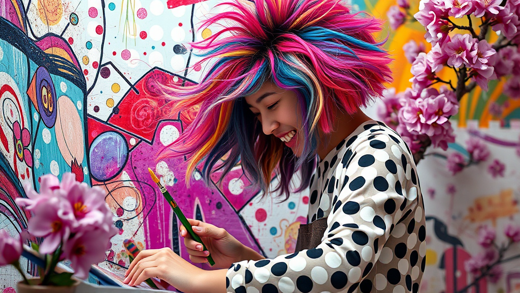 A lively artist energetically crafting an abstract masterpiece, their hair a kaleidoscope of colors, reminiscent of Kazuo Oga's style. The scene is infused with polka dots and blossoming flowers, highlighted by vivid purples and pinks, demonstrating a deep artistic influence. Captured in extraordinary detail, the image boasts 32K UHD clarity and sharp focus, embodying a sense of dynamic creativity in a 2:3 aspect ratio.
