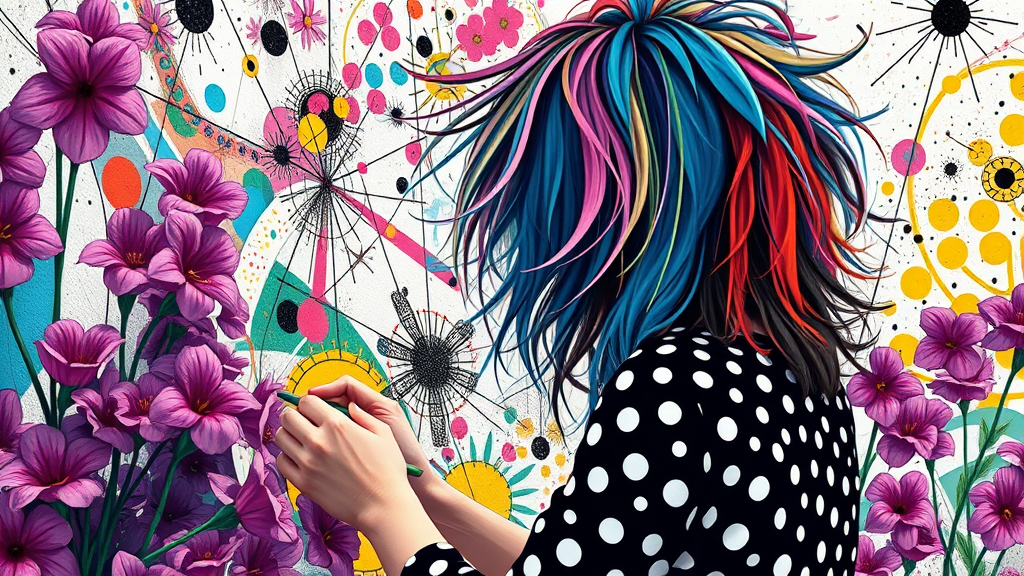 A lively artist passionately working on an abstract masterpiece, their hair a kaleidoscope of colors, evoking the energy and style of Kazuo Oga. The scene is infused with polka dots and an explosion of blooming flowers in shades of purple and pink. This artistic vision is rendered in ultra-high definition with sharp focus, capturing every detail of the vibrant creation.