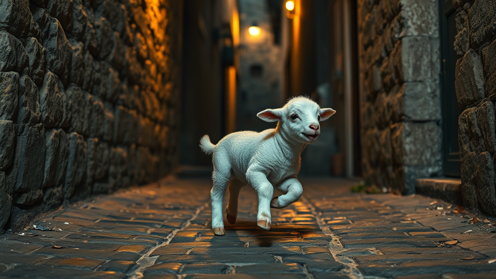 A lively baby lamb joyfully frolicking through the ancient, narrow streets of Jerusalem, its laughter echoing softly amidst the cobblestones; the atmosphere is imbued with dark, ambient lights casting dramatic shadows, creating a cinematic and hyper-realistic scene. The detailed surroundings capture the essence of the city, with its timeworn stone buildings and intricate textures, all rendered in stunning 4k resolution, evoking a sense of timeless wonder.