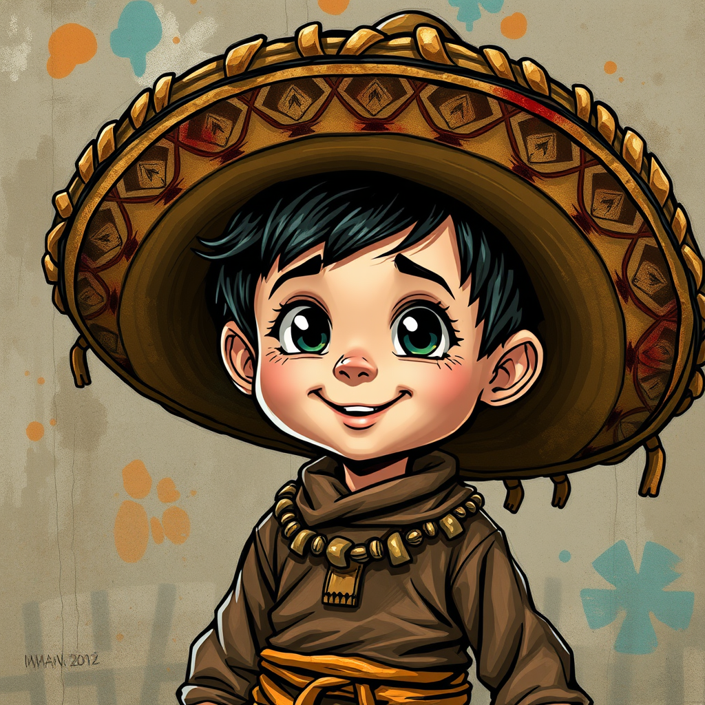 A lively cartoon boy with an oversized sombrero, depicted in intricately detailed comic book style art, featuring a rich palette of dark cyan and bronze hues with artistic stains and washes. His expression exudes child-like innocence, while his costume is richly detailed and imaginative. The scene conveys an impression of homage and cultural blending, with vibrant textures that capture the playful essence of youthful exploration.