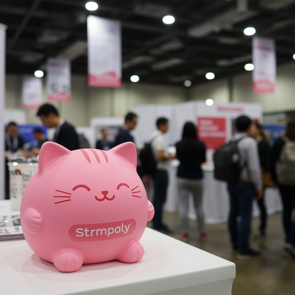A lively conference scene filled with people milling about and colorful banners hanging from the ceiling. Amidst the hustle and bustle, a pink stress-relief toy shaped like a plump, playful kitten sits prominently on a display table, its soft surface invitingly squishable. The kitten's cheerful face is emblazoned with a stylish company logo in contrasting white, catching the eye of passersby. The bright lighting of the venue highlights the toy's glossy finish, making it an attractive keepsake for conference attendees seeking a moment of relaxation amidst the excitement.