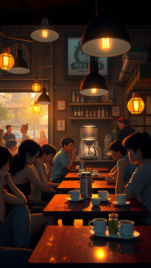 A lively evening at a cozy café filled with young people savoring their coffee, the atmosphere enriched by cinematic lighting and a dedicated barista at the counter. The scene is an exquisite blend of digital art with glowing elements, capturing a hand-drawn essence in an ultra-detailed 4k cinematic feel. Utilizing octane render techniques with cinema 4D and blender, the ambiance is dark yet inviting, exuding a masterful charm in sharp focus. The illustration carries a humorous touch, distinguished by its majesty and vibrant colors, reminiscent of the enchanting style of Studio Ghibli combined with the work of artists like Jeremy Mann, Greg Manchess, and Antonio Moro. This concept art is hyperrealistic, capturing the spirit of a trending piece on platforms like ArtStation, presented with intricate details and a dramatic, photorealistic finish. Brought to life with vivid colors and vivid modelshoot-style clarity, it maintains a professional art aesthetic inspired by the acclaim of master artists such as Greg Rutkowski.