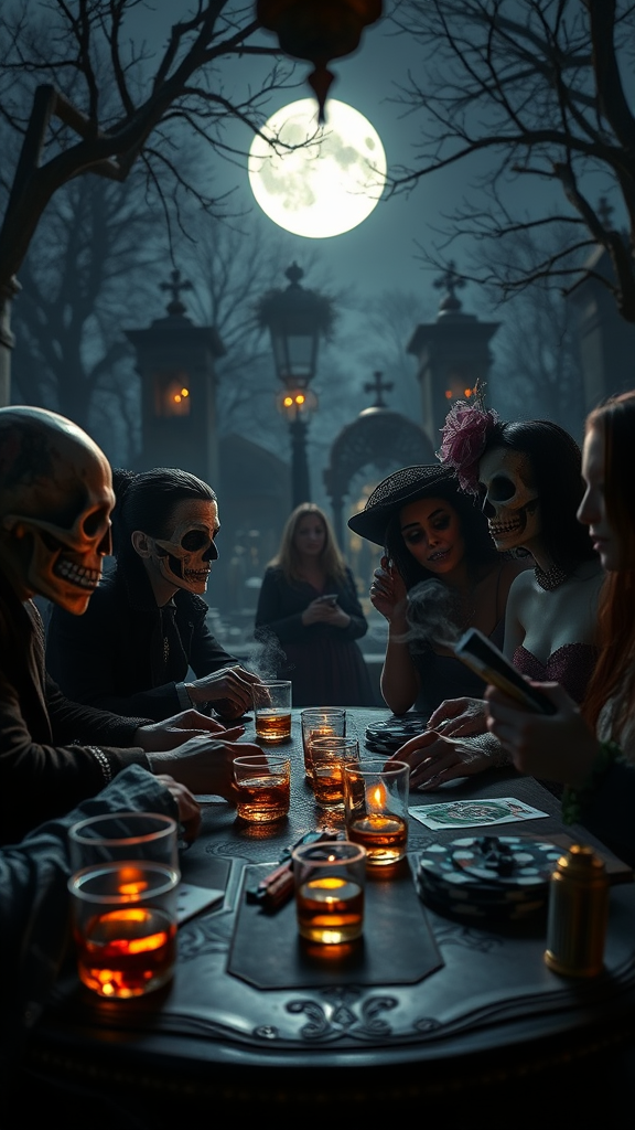 A lively gathering in a moonlit cemetery, where a group celebrates Día de Muertos by playing poker under Tim Burton's cinematic touch. Calaveras and elegant Catrinas join the game, surrounded by the fragrant haze of cigar smoke and glinting whisky glasses on the table. The scene, captured in sharp focus, features a rich palette of vivid colors with a moody, eerie atmosphere. This ultra-high resolution image emphasizes details, while employing a dreamy bokeh effect that enhances its cinematic allure. The image maintains its artistic integrity without borders, blur, or digital imperfections, staying true to a beautifully surreal and spirited homage to the Mexican Day of the Dead.