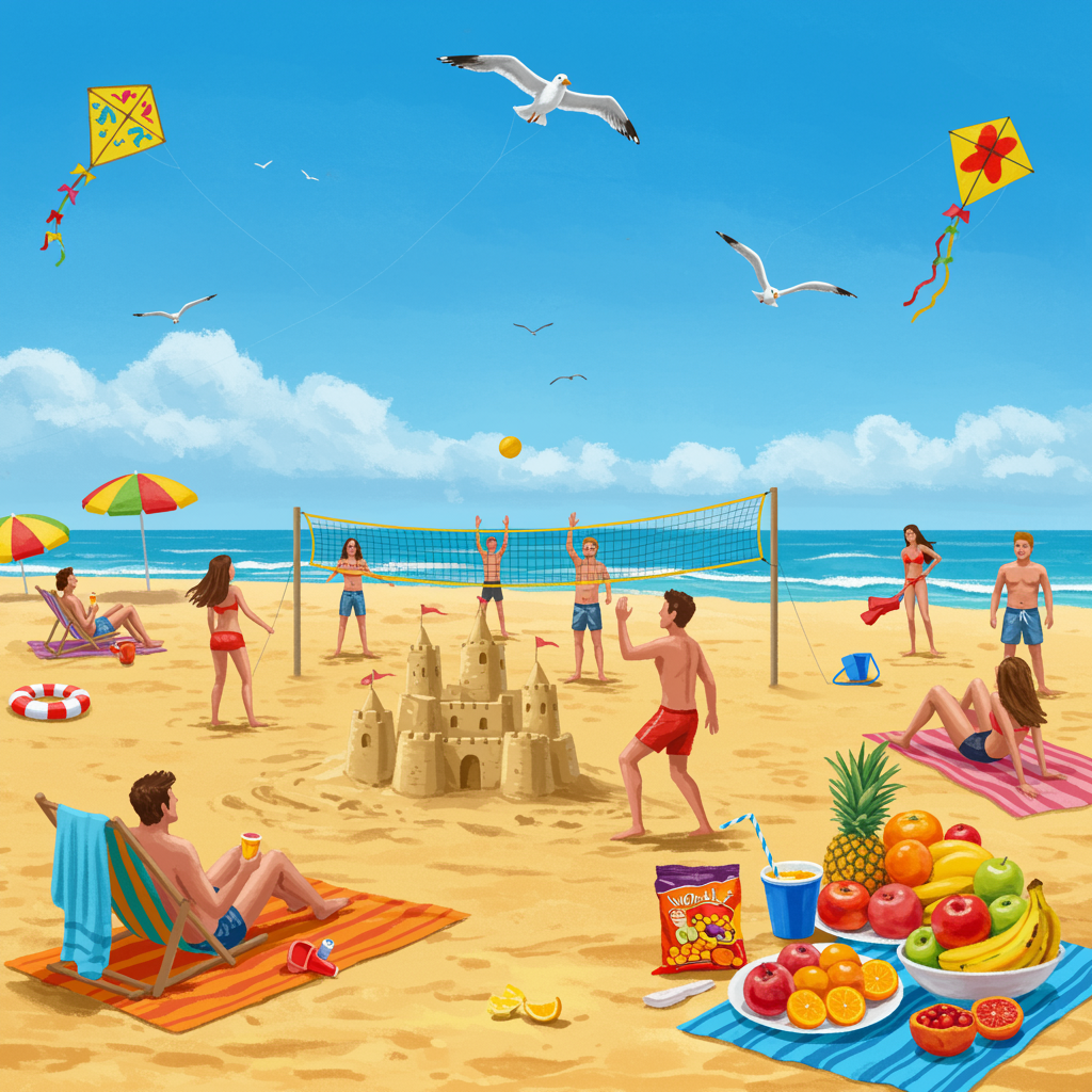 A lively group of friends is relishing a perfect day at the sun-drenched beach. The sky is a brilliant azure, devoid of clouds, as the golden sun casts a warm glow over the scene. Crystal-clear waves gently lap against the shore, creating a soothing rhythm. The beach is dotted with vibrant umbrellas and colorful towels, while an impressive sandcastle with intricate towers and moats stands proudly as its centerpiece. Friends are immersed in a spirited game of beach volleyball, their laughter and cheers mixing with the sound of the ocean. Nearby, a couple of kites decorated with bright patterns dance gracefully in the sky. Others lounge contentedly on comfy beach chairs, soaking up the sun's rays. A delightful snack table brims with a variety of fresh, juicy fruits and chilled drinks, inviting everyone to indulge. Overhead, seagulls glide effortlessly through the air, their calls adding a harmonious note to the cheerful atmosphere. It's a vivid, playful panorama of summer fun.