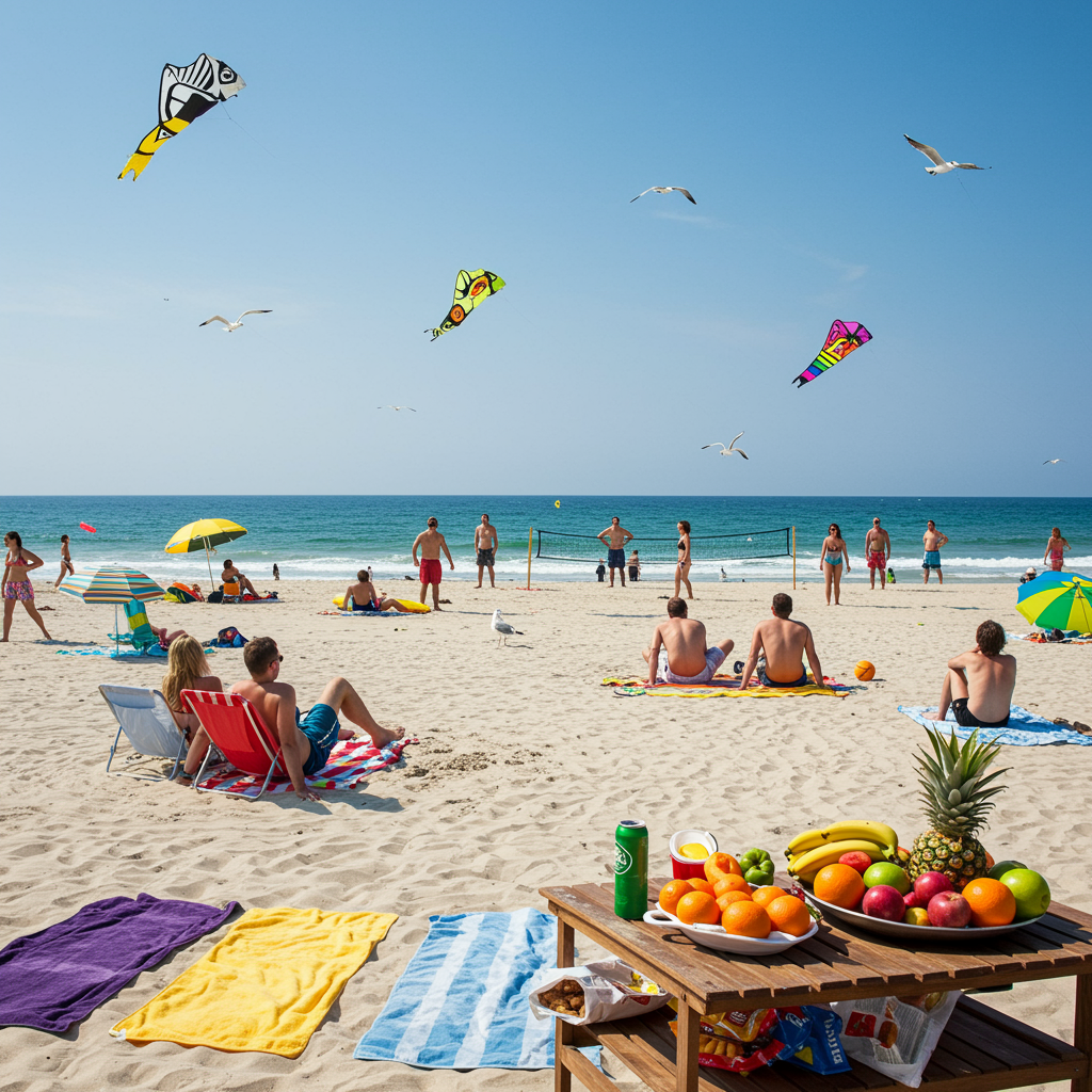 A lively group of friends relishes a sun-drenched day at the pristine beach, where the azure sky stretches endlessly above them. The ocean waves cascade gently onto the shore, harmonizing with the vibrant tableau of colorful beach umbrellas and towels dotting the sandy landscape. Energetic matches of beach volleyball unfold near the water's edge, while kites of various shapes and hues dance joyfully in the sky. Others are reclining on cushioned beach chairs, embracing the tranquil ambiance. Nearby, a snack table brims with an assortment of fresh tropical fruits and chilled beverages, enticing a quick respite. Seagulls glide gracefully above, adding to the rhythmic symphony of the seashore. This scene is a vivid, playful snapshot of seaside bliss, captured in ultra-high-definition.