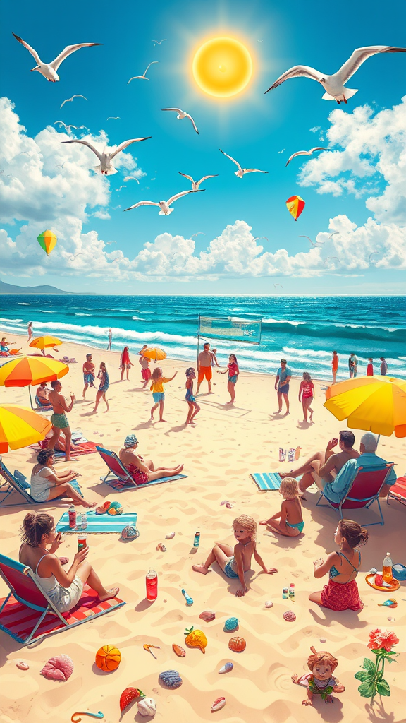 A lively group of friends revels in a day at the beach, their laughter mingling with the sound of the ocean waves gently lapping at the shore. The sun bathes everything in a warm, golden light as seagulls glide gracefully overhead. The azure sky is dotted with vibrant kites dancing in the breeze. The sandy beach is a riot of colors with an array of bright beach umbrellas and towels spread across the shore. Nearby, a spirited game of beach volleyball unfolds, with players diving and leaping in the soft sand. Others lounge on comfortable beach chairs, sipping on refreshing drinks and sharing juicy, ripe slices of tropical fruit from a well-stocked snack table. Children busily construct sandcastles, their imaginations running wild as they decorate them with seashells and seaweed. The scene is rich with the joyful essence of summer, a kaleidoscope of colors and sounds, captured in a detailed, vibrant, and whimsical illustration.