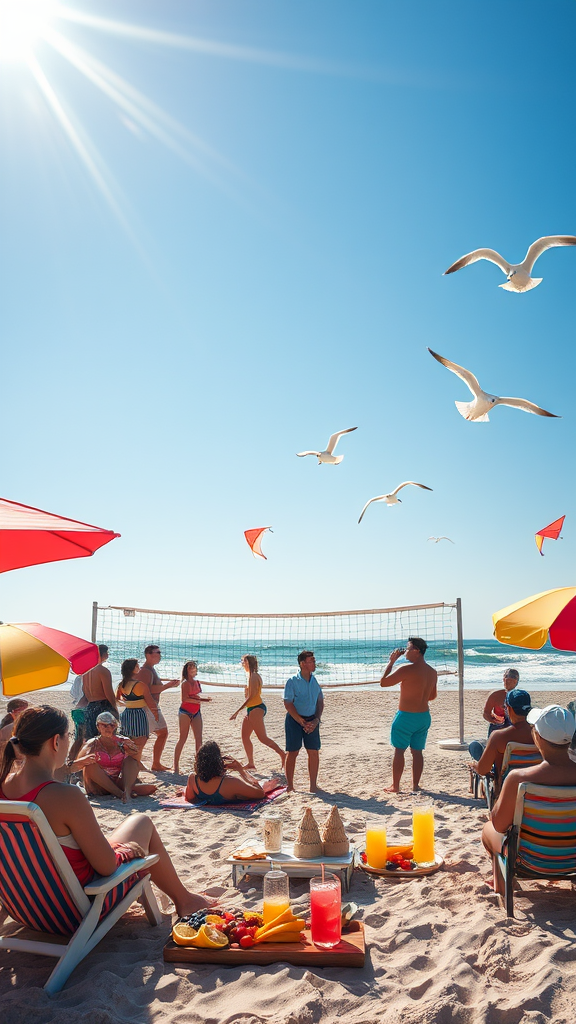 A lively group of friends savoring a sunlit day at the beach, where golden rays spill across the clear blue sky. Waves lazily lap the shore, and the scene is dotted with vibrant beach umbrellas and colorful towels, accented by imaginative sandcastles. The friends are immersed in spirited activities: some are engaged in a spirited game of beach volleyball, their movements agile and joyous, while others are skillfully maneuvering kites that dance with the breeze. A few lounge comfortably in beach chairs, sunkissed and relaxed. Nearby, a buffet of fresh fruit and icy drinks tantalizes with its vivid colors and refreshing promise. Overhead, seagulls gracefully glide, occasionally swooping low to investigate the cheerful chaos. This rich tapestry of life captures the essence of a carefree beach escapade, full of laughter and sunlit wonder.