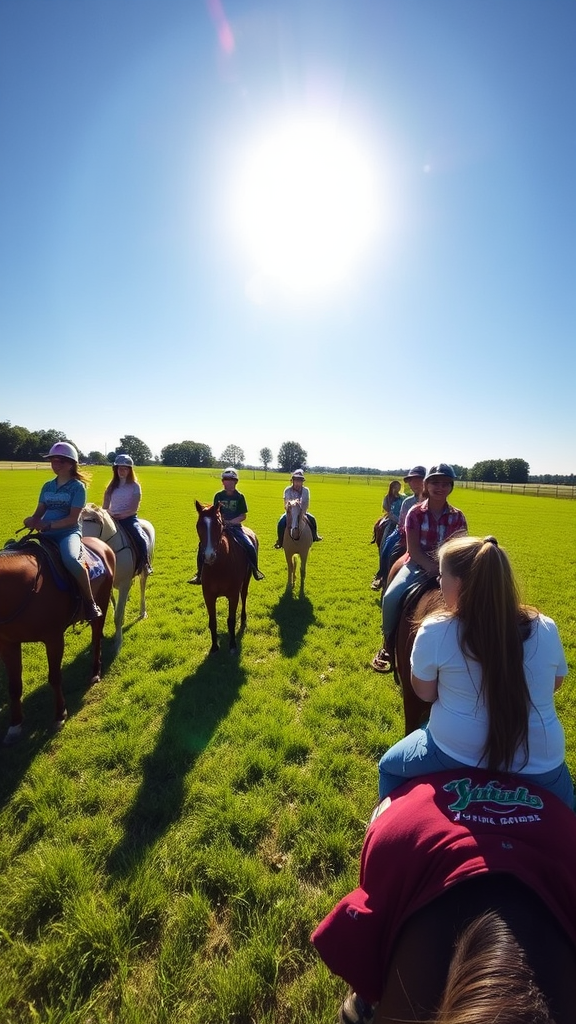 A lively group of students eagerly learning horseback riding in a sprawling green field, the sun shining brightly overhead, casting playful shadows. The scene captures the essence of an outdoor adventure, with horses gently trotting and students wearing expressions of excitement and focus. It's a vibrant moment under the clear midday sky, encapsulating the harmony between nature and human spirit, a serene yet dynamic atmosphere where learning and joy collide in the warmth of the sunlit outdoors.