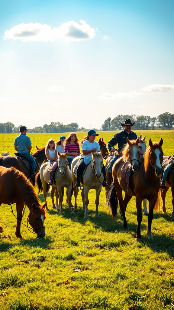 A lively group of students eagerly learning horseback riding, surrounded by an expansive green field under the midday sun. The scene captures a still movie frame bathed in warm, golden sunlight. The students, filled with a mix of excitement and concentration, are guided by an experienced instructor. Horses of various colors graze peacefully nearby, adding to the vibrant and serene atmosphere of the outdoor setting. The sky is a clear blue, dotted with a few fluffy clouds, creating a perfect backdrop for this joyful learning experience.