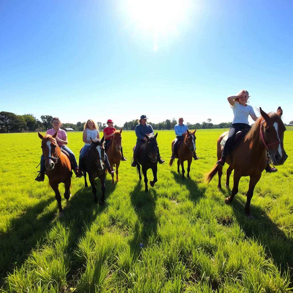 A lively group of students eagerly learning horseback riding in a lush, expansive green field. The bright midday sun casts a warm, inviting glow over the scene, highlighting their energetic spirits. The horses, calm yet spirited, reflect the serene ambiance of the countryside. Shadows from the distant trees dance across the grass, capturing a moment of joyous discovery and adventure in nature's embrace. The sky is a clear, uninterrupted blue, adding a sense of vastness and freedom to this picturesque snapshot of youthful exploration.