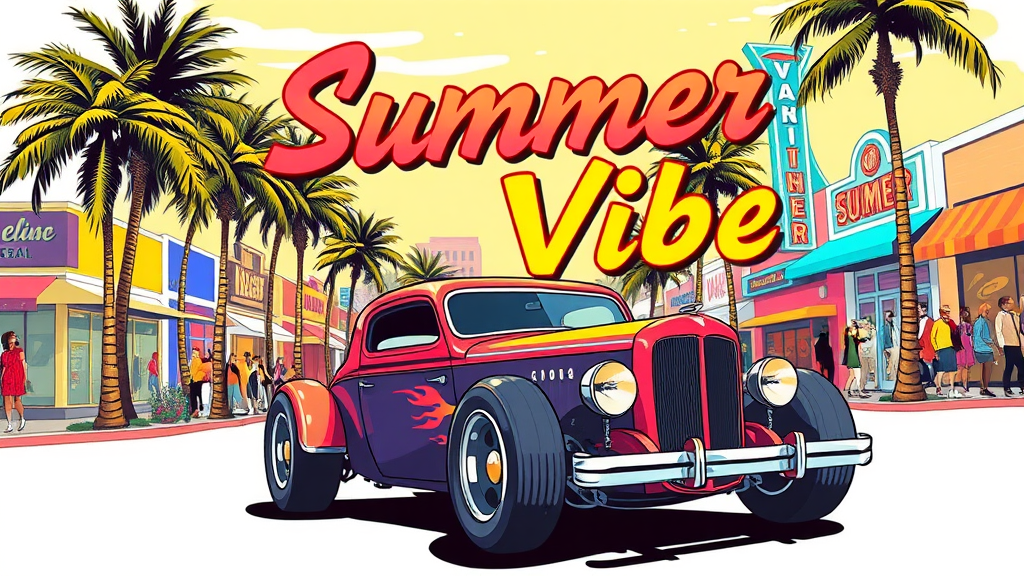A lively illustration featuring a classic hot rod cruising down a sunlit street lined with swaying palm trees. In the background, a vibrant retro cityscape is filled with colorful buildings, a glowing neon sign, and a lively crowd of people enjoying the day. The text 'Summer Vibes' is styled in a retro, distressed font, with each letter in a different bright hue, evoking a sense of nostalgia. This design is ideal for a t-shirt print, presented on a clean white background.