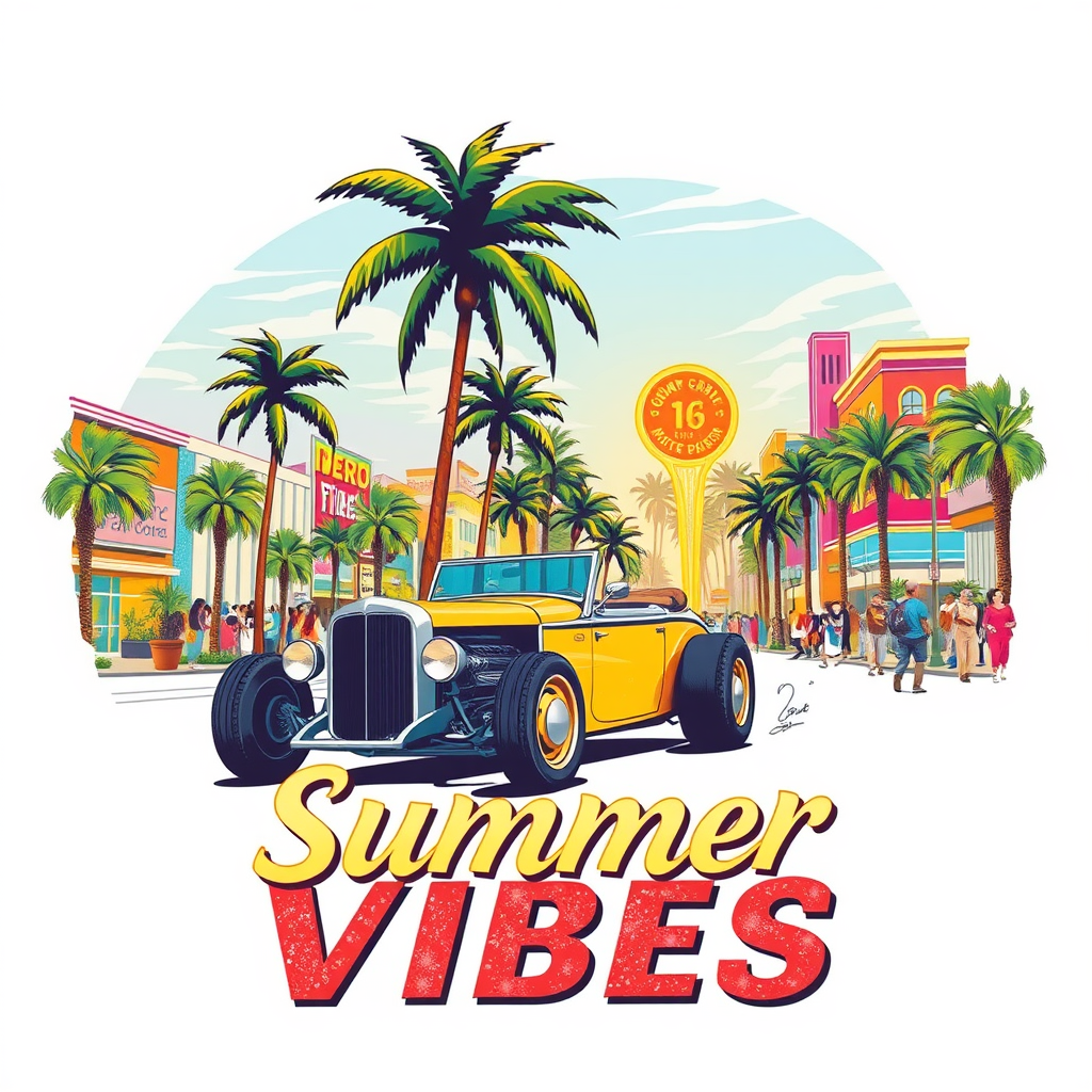 A lively illustration of a classic hot rod driving down a sunlit avenue flanked by palm trees. In the background, a retro cityscape with vibrant buildings, a neon sign, and a lively crowd creates a nostalgic atmosphere. The phrase 'Summer Vibes' appears in a vintage, distressed font, each letter in a different color, capturing a sense of nostalgia. The design, ideal for a t-shirt, features a clean white background, ensuring a clear and vivid image.