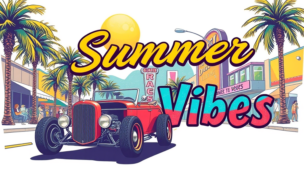 A lively illustration portraying a classic hot rod driving down a sunlit avenue lined with swaying palm trees. In the background, a retro cityscape features vibrant buildings, a glowing neon sign, and a lively crowd. The phrase 'Summer Vibes' is displayed in a nostalgic, worn-out font, with each letter in a different color, evoking a sense of retro charm. This design is ideal for a t-shirt print, set against a clean white backdrop.