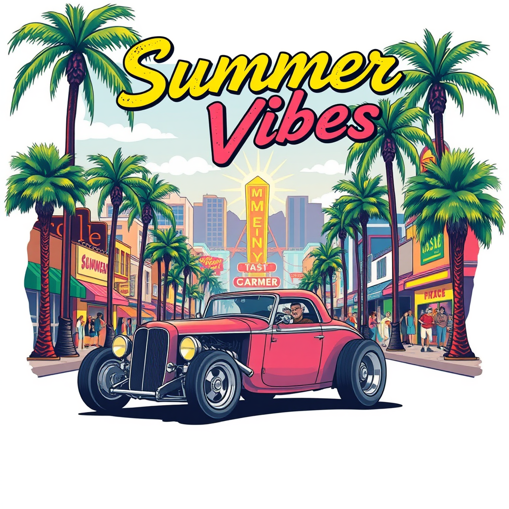 A lively illustration showcases a classic vintage hot rod cruising down a sunlit avenue, bordered by tall, swaying palm trees. In the backdrop, a retro cityscape bursts with vibrant hues from colorful buildings, a glowing neon sign, and a dynamic crowd of people. The text 'Summer Vibes' is artistically displayed in a retro, distressed style, with each letter painted in a different bright color, evoking a nostalgic feel. Designed for a t-shirt print, the scene sits against a clean white background, capturing the essence of a carefree summer day.