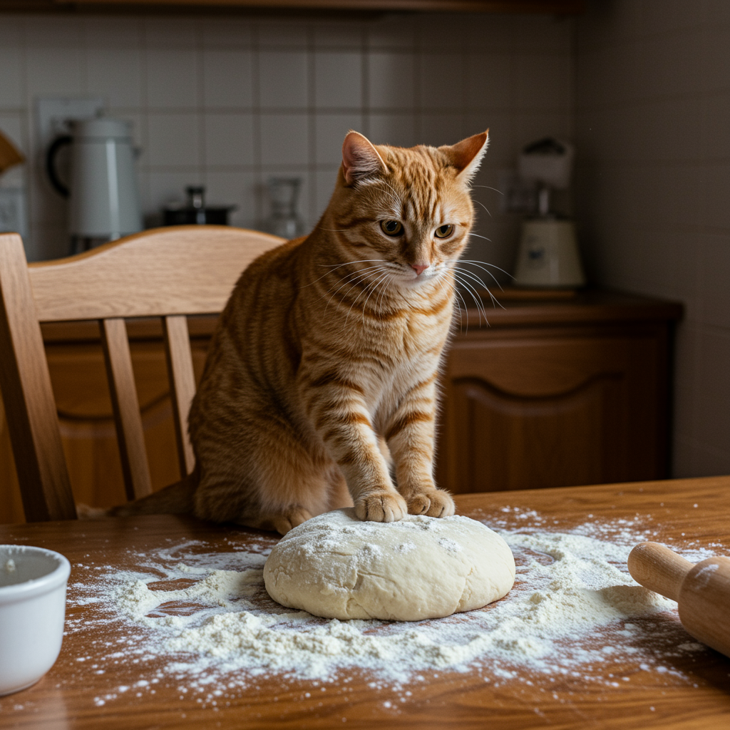 A lively orange tabby perched on a wooden kitchen chair, skillfully purring as it rhythmically paws at a mound of flour-dusted dough scattered across the table, its tail flicking with concentration.