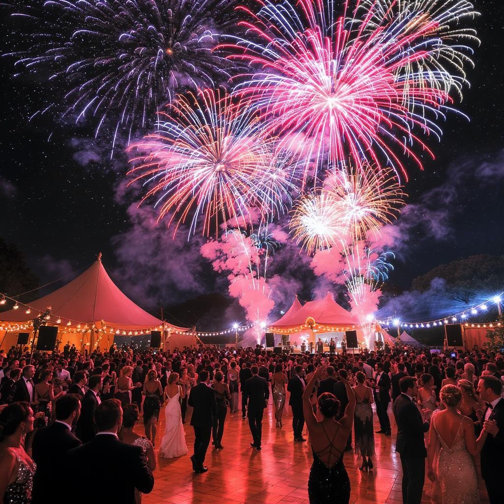 A lively outdoor celebration reminiscent of a Great Gatsby party, where a large crowd of elegantly dressed guests dance under the starlit night sky. Brilliantly colorful fireworks paint the heavens above, creating a spectacular backdrop that adds a sense of wonder and excitement. The scene is intricately detailed, capturing the opulent ambiance and vibrant energy of this glamorous gathering in stunning clarity.
