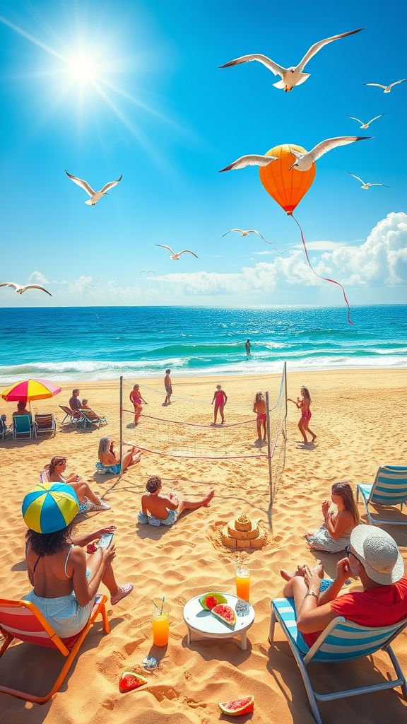 A lively scene unfolds as a group of friends embrace a perfect day at the beach, where the sun beams warmly from a clear blue sky. The serene ocean stretches out, with gentle waves rhythmically caressing the golden shore lined with vibrant beach umbrellas, lounge chairs, and intricately sculpted sandcastles. Bursts of laughter and friendly competition arise from a spirited game of beach volleyball, while vivid kites soar and dip gracefully against the backdrop of the expansive sky. Others recline on comfortable beach chairs, sipping icy drinks and savoring slices of juicy watermelon and tropical fruits from the nearby snack table. Seagulls glide above, occasionally diving towards the glistening sea. The whole scene is bathed in a rich palette of colors, capturing the essence of a playful and carefree summer day by the ocean.