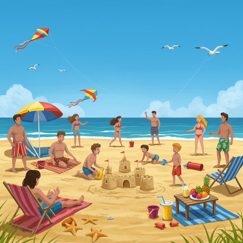A lively scene unfolds as a group of friends relish a perfect day at the beach, with the golden sun warm and the sky an unending, cerulean blue. The ocean waves lap softly against the shore, a soothing backdrop to the colorful array of beach umbrellas and vibrant towels. Kids dart around, adding finishing touches to imaginative sandcastles adorned with shells, while others engage in a spirited game of beach volleyball, laughter mingling with the salty breeze. Nearby, a couple of friends are skillfully flying kites, vibrant tails dancing gracefully in the air. Comfortable beach chairs offer a resting spot for those soaking in the sun’s glow. A delightful snack table is laden with fresh tropical fruits and chilled beverages in frosty glasses. The scene is animated by the occasional cry of seagulls gracefully swooping overhead, capturing the essence of a joyful, sun-drenched day by the sea, with an inviting palette of colors and playful details bringing it to life.