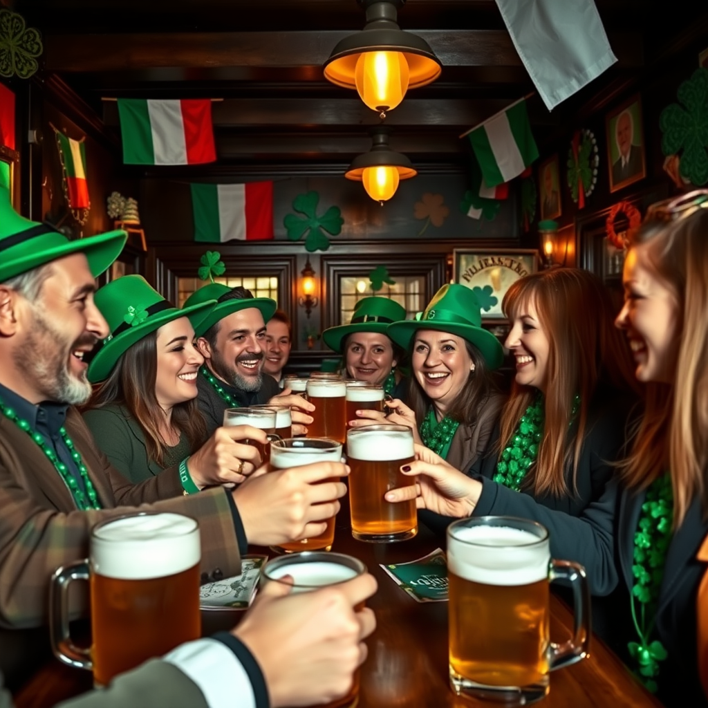 A lively scene unfolds in a cozy Irish pub as patrons clink their frothy pints of beer in celebration of St. Patrick’s Day. Men and women dressed in festive green attire, some sporting quirky hats and shamrock accessories, share laughter and cheer. The ambient light casts a warm glow over dark wooden interiors, where traditional Irish music fills the air. An assortment of Irish flags and decorations adorns the walls, while four-leaf clovers and mugs brimming with beer add to the jolly atmosphere. The camaraderie and vibrant energy of the occasion evoke a sense of joy and Irish pride.