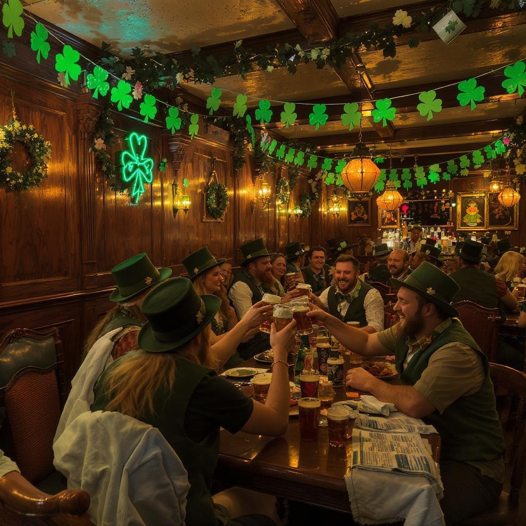 A lively St. Patrick's Day celebration filled with clinking beer glasses and cheerful toasts, features people wearing festive green attire and stylish top hats, gathered in a cozy Irish pub adorned with shamrock decorations, creating a warm and inviting atmosphere.