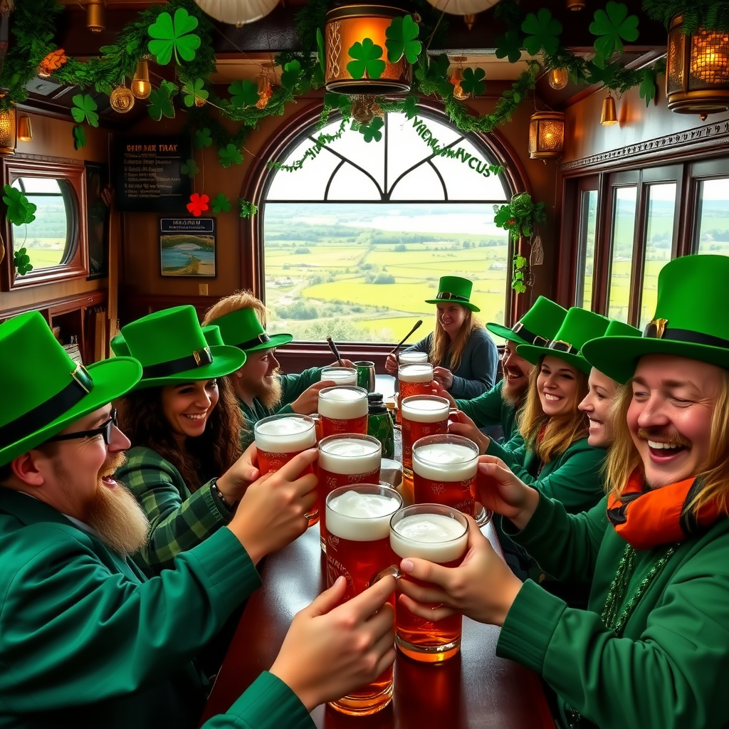 A lively St. Patrick’s Day celebration unfolds in a charming Irish pub, where patrons dressed in green attire and leprechaun hats clink their frothy mugs of beer under a cascade of festive decorations. Shamrocks adorn the walls, and a traditional Irish band plays lively tunes in the background. The setting captures the essence of Irish culture with cheerful camaraderie and an atmosphere brimming with joy and merriment, set against the backdrop of a sprawling emerald countryside visible through large windows.