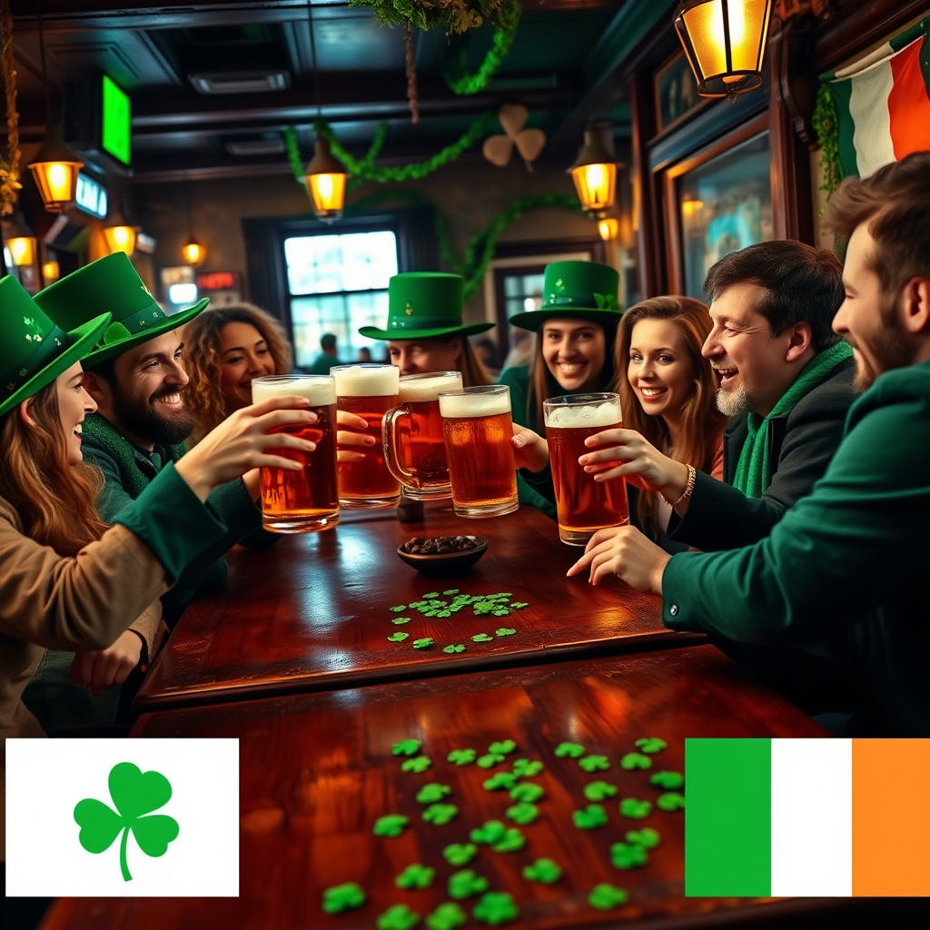 A lively St. Patrick's Day celebration unfolds with friends gathered in an Irish pub, clinking frothy pints of beer and adorned in festive attire, including top hats and shamrocks. The warm glow of antique lights reflects off rustic wooden tables, while a jovial atmosphere is enhanced by traditional Irish music playing in the background. Cheerful patrons, wearing vibrant green garments, exchange laughter and stories, surrounded by decorations of the Irish flag and scattered clovers, capturing the essence of camaraderie and cultural appreciation.
