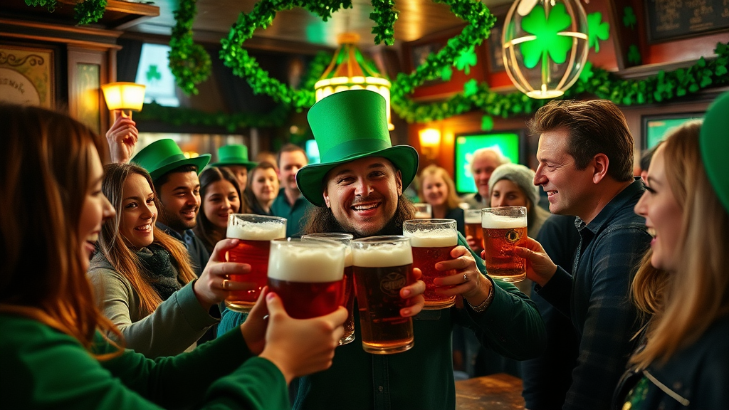 A lively St. Patrick's Day scene unfolds with people joyfully celebrating in an Irish pub adorned with shamrock decorations. Laughter fills the air as friends toast with frothy pints of beer, clinking their glasses in jovial camaraderie. A man wearing a cheerful green top hat stands out in the crowd, embodying the festive spirit. The warm, inviting atmosphere is accentuated by traditional Irish music playing in the background, creating an ambiance of merriment. The scene, captured in a vibrant and dynamic 16:9 aspect ratio, reflects the rich culture and joyous essence of this beloved holiday.
