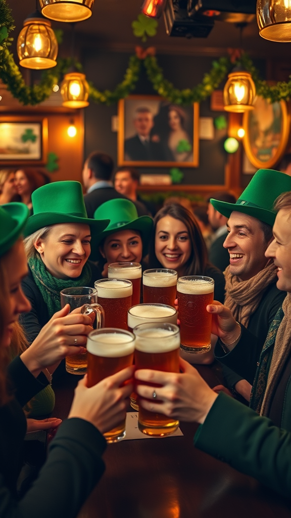A lively St. Patrick’s Day scene with friends gathered in an Irish pub, toasting with frothy pints of beer, wearing playful green hats, surrounded by shamrock decorations, laughter echoing through the buzzing atmosphere, the warm glow of vintage lights adding charm to the festive celebration.