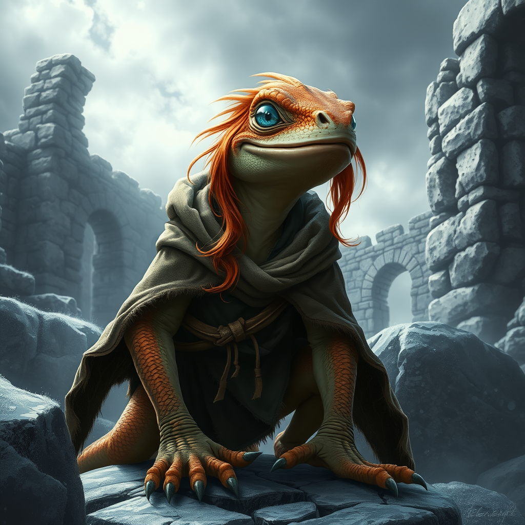 A lizardfolk clad in a tattered cloak, ginger hair cascading around its blue, gleaming eyes, smiles mischievously amid ancient ruins. The overcast sky breaks with god rays casting a mystical glow on frost-kissed stones. In this fantasy setting, the creature adopts an exaggerated pose, its limbs slightly twisted and elongated. The scene exudes a sense of wonder through low-resolution texture with subtle distortion and a pixelated appearance. Glossy surfaces catch light in strange angles, while moiré patterns subtly distort the background. A faint, crude signature seemingly scribbled hurriedly, adds a touch of mystery. The image suffers from compression artifacts and aliasing, giving it a blurry, grainy feel with exaggerated contrast. Despite these flaws, the composition is intriguing, combining elements of error and effect to evoke a sense of otherworldly charm and beginner's experimentation.