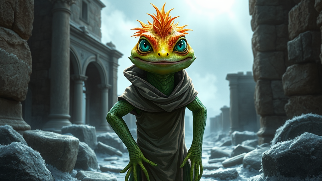 A lizardfolk in a tattered cloak stands amidst ancient ruins, their piercing blue eyes glinting mischievously as they flash a wide smile. The ginger hair atop their head catches the scant rays of light breaking through an overcast sky, casting an ethereal glow. Surrounding the scene, frost clings to stone surfaces, adding a touch of chill to the air. The figure strikes an exaggerated pose, their limbs unusually elongated and twisted with a gleeful smirk that hints at secret knowledge. A poorly drawn DnD text watermark lurks in the corner of the image, which is riddled with low-resolution effects: pixelation, distortion, blurry patches, and excessive compression artifacts that obscure finer details. The glossy surface reflects hints of moiré patterns and the entire composition is marred by bad contrast, aliasing, and graininess. A fake signature sits awkwardly in a corner, while the scene's overall hyper-exposure and glitchy elements emphasize its beginner-level execution, resulting in an image replete with duplication errors and pixelated anomalies.