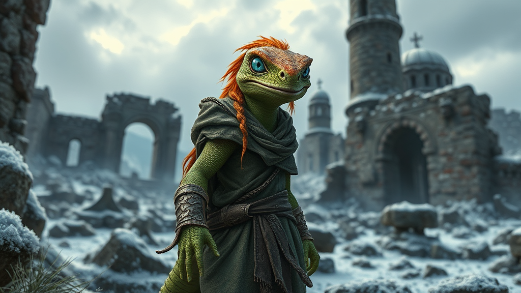 A lizardfolk with ginger hair and blue eyes, wearing a tattered cloak, stands amidst ancient ruins. The setting is overcast, with occasional god rays piercing through the clouds. Frost covers the ground, adding a chill to the air. The lizardfolk has a confident smirk as they explore the ruins. The image is intentionally low-quality with intentional pixelation, showing jpeg compression artifacts that create a distorted and blurry appearance. Glossy surfaces reflect light awkwardly, and the overall scene suffers from aliasing and moiré patterns. The composition is exaggerated, with exaggerated limb proportions, giving the character a twisted and unusual pose. The image exhibits a grainy texture with high-contrast and an overexposed look, with signs of downsampling leading to a pixelated and fake appearance. Errors and duplication are noticeable, while symmetrical patterns create visual confusion. The image also has signs of beginner artistry, with a poorly drawn quality that features glitch-like distortions. A watermark and the artist's signature are visible, further emphasizing the amateur nature of the work.