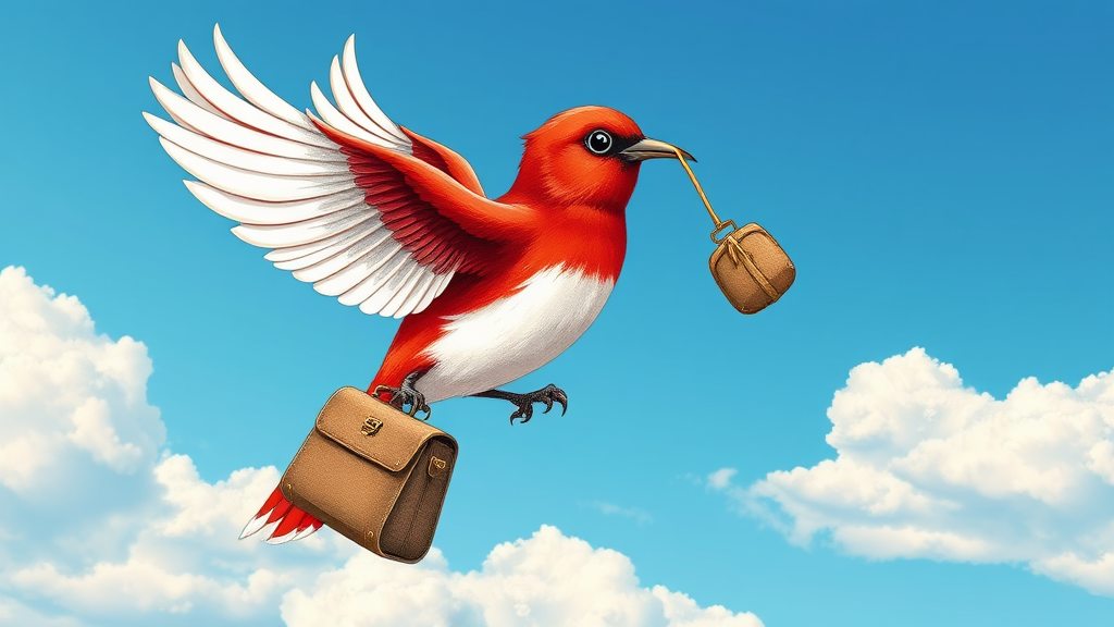 A logo for a travel website featuring a vibrant red bird with gracefully detailed white wings, clutching a vintage travel bag in its beak. It's set against a serene blue sky filled with fluffy white clouds, evoking a sense of adventure and freedom. The design is infused with intricate artwork reminiscent of Beatrix Potter's style, showcasing a charming cottage core aesthetic. Rendered in 8K resolution, the logo is highly detailed and captured from a 45-degree angle, providing a dynamic perspective that enhances its visual appeal.