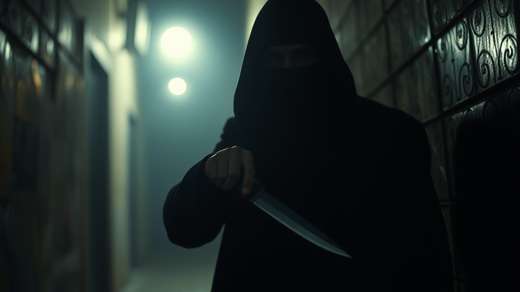 A lone assassin in a dimly lit alley, poised with a glinting knife, captures the intricate artistry of shadows and light. Inspired by Rutkowski's cinematic style, the scene comes alive with a dramatic depth of field, accentuating the tension in the air as the ambiance feels as if curated in a Lightroom masterpiece.