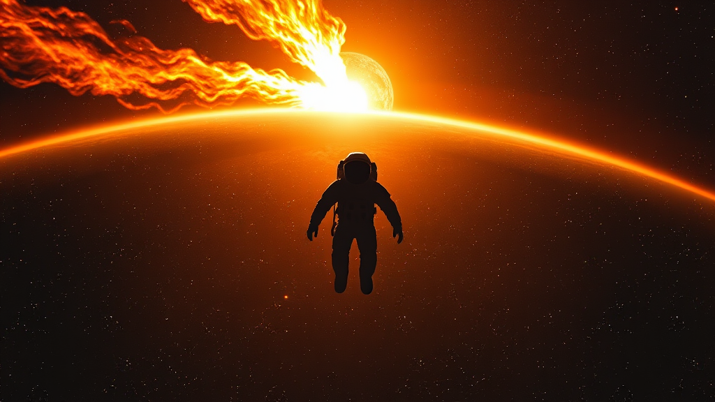 A lone astronaut floats in the vastness of space, gazing in awe as a coronal mass ejection erupts from the fiery surface of the sun. The scene is bathed in a breathtaking display of vibrant solar flares, casting an ethereal glow across the infinite canvas of stars. The astronaut, silhouetted against the brilliant spectacle, witnesses this cosmic phenomenon in cinematic clarity, captured in stunning 8k resolution as if rendered in unreal engine. The grandeur and isolation of space amplify the surreal beauty and powerful energy of the sun's eruption, creating an unforgettable visual experience.