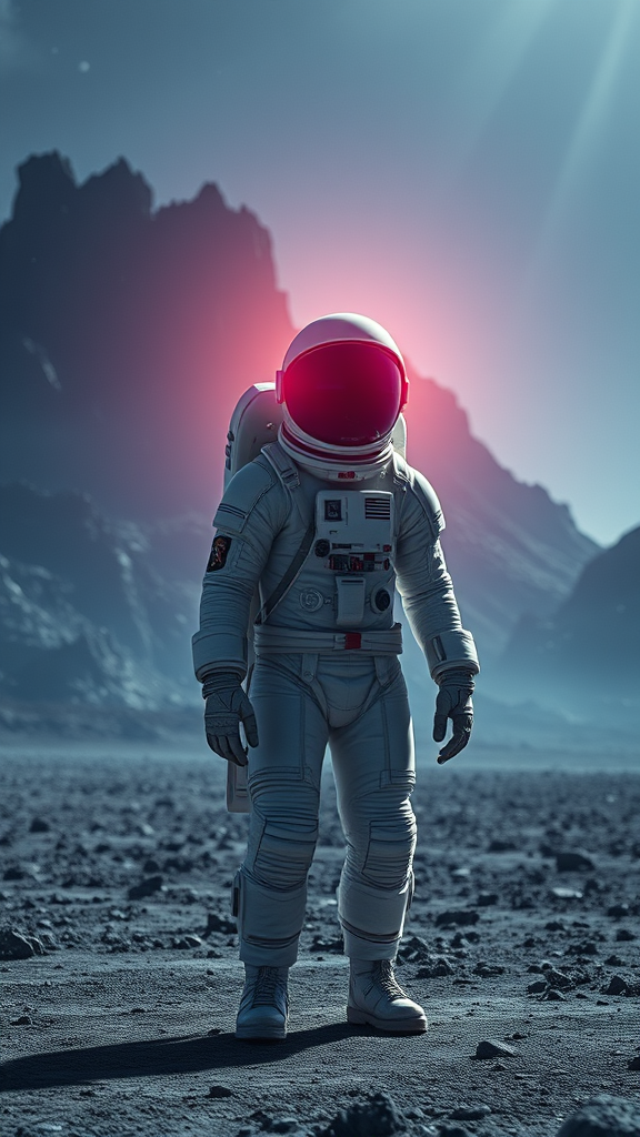 A lone astronaut stands in a vast, alien field, his figure anatomically precise within a sleek suit. The helmet radiates a soft, pink glow against an otherworldly landscape reminiscent of Death Stranding. Dynamic lighting cascades across the scene, with intricately detailed features casting dark shadows and high flares. The environment feels both hyper-real and surreal, as if rendered in an advanced, unrealistic Engine 5. The scene is captured in a 3D cinematic style, enveloped in an atmosphere of mystery and intrigue, with the aspect ratio of 9:16 emphasizing the grandeur and depth of the terrain.