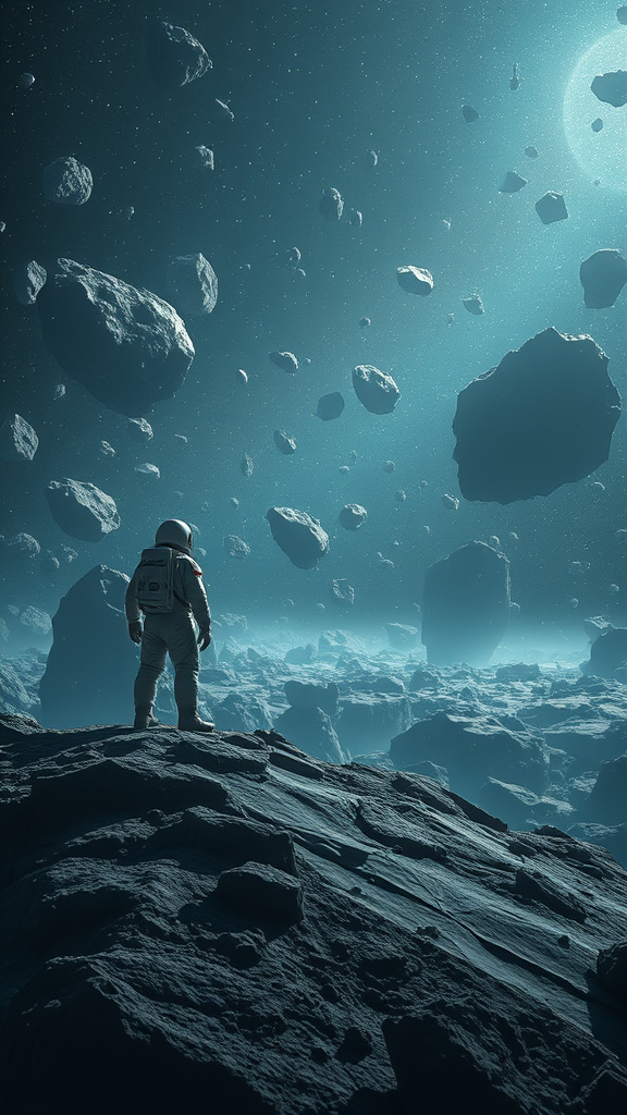A lone astronaut stands on the rugged surface of a distant asteroid, gazing out over a vast and mesmerizing asteroid field, each celestial rock bathed in the ethereal glow of distant stars. The scene is a masterpiece of sci-fi ambiance, capturing a moment of solitude and awe in the infinite expanse of space. The intricately detailed textures of the asteroid and the breathtaking expanse of floating debris are rendered in stunning 4k resolution, immersing the viewer in a surreal yet realistic vision of cosmic wonder.