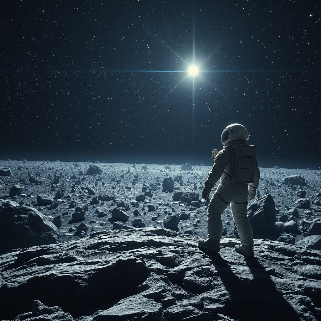 A lone astronaut stands on the rugged surface of a distant asteroid, gazing out across a breathtaking expanse of an asteroid field. The scene captures a masterpiece of sci-fi wonder, where countless celestial bodies float through the vast, velvet-black void of space. Stars glitter in the background like scattered diamonds, casting an ethereal glow over the meticulously detailed landscape. The crisp, high-definition resolution unveils every nuanced texture of the asteroid's surface, enhancing the atmosphere's immersive quality. The astronaut's reflective visor catches the shimmering light, adding a touch of mystery and exploration to the scene. This highly detailed and atmospheric vision invites viewers to contemplate the infinite possibilities beyond our world.