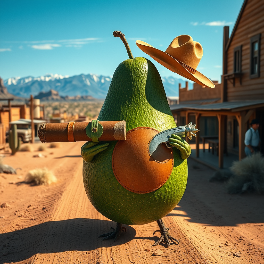 A lone Avocado desperado, "El Aguacate Negra," rides into town on a dusty, weathered trail, a cigar clenched between its pit, surveying the high noon landscape of the Wild West's sun-scorched desert townscape of cacti, tumbleweeds, and worn leather buildings, its skin a deep emerald green, worn and battle-hardened from years of facing down scorching temperatures and ruthless outlaws, its stem sporting a battered old Stetson hat, and its "holster" a chunk of worn brown leather wrapped around a makeshift wooden handle adorned with a gleaming silver spur-shaped rivet, the surrounding terrain a labyrinth of vast expanses of sand and rock formations that stretch to the horizon, where the blue sky clashes with the distant outline of a snow-capped mountain range.